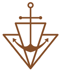 A brown line drawing of an anchor combined with a diamond shape with an arrow pointing downward.